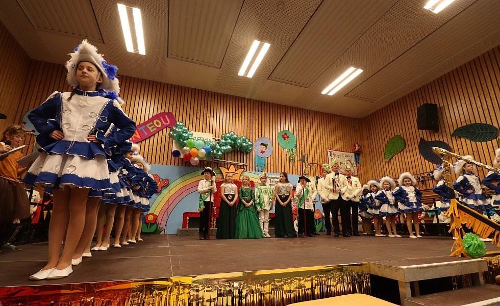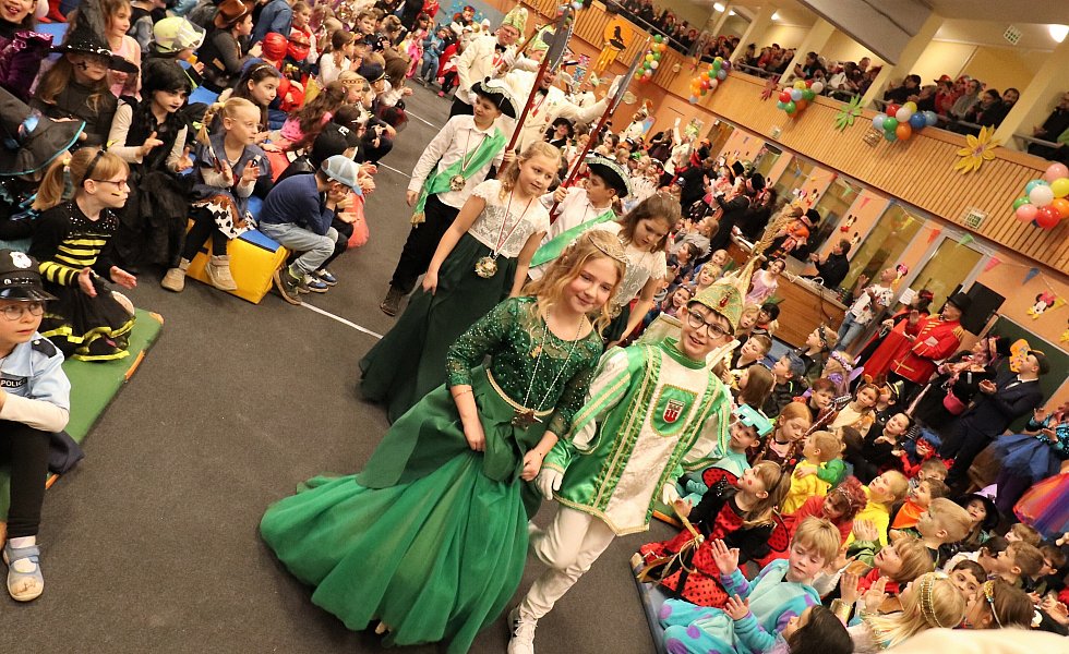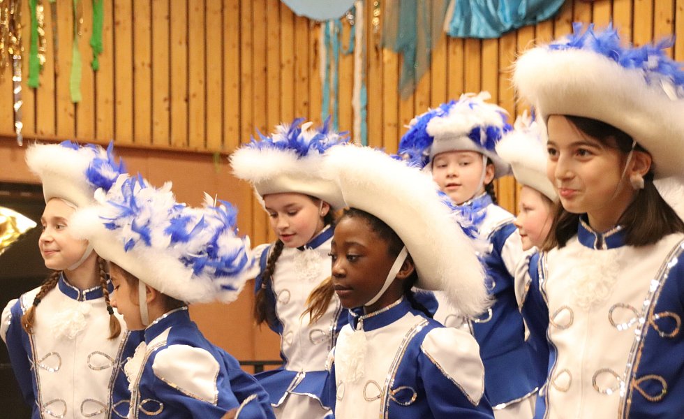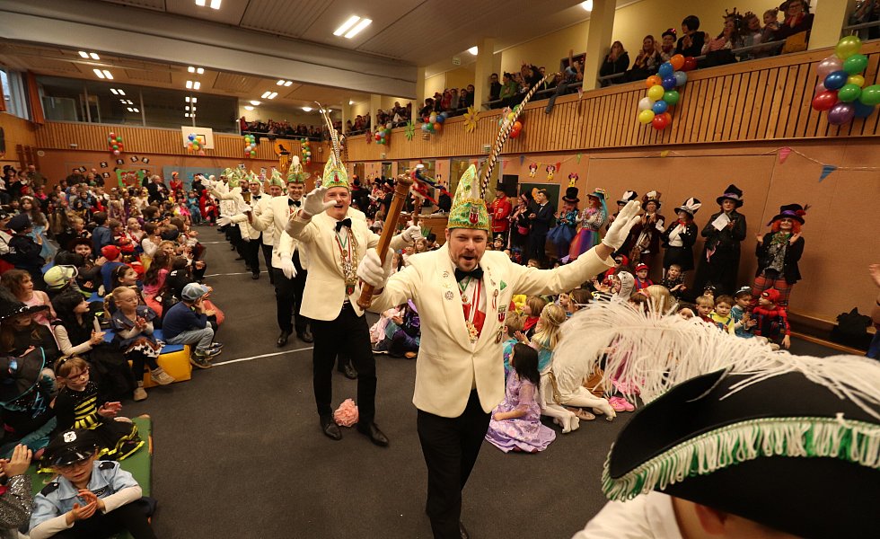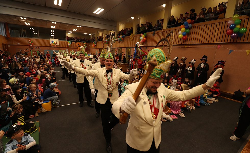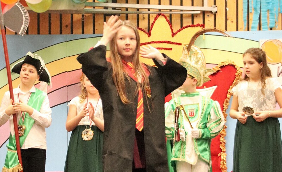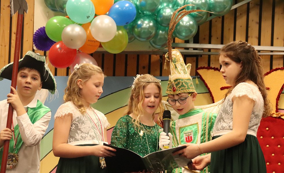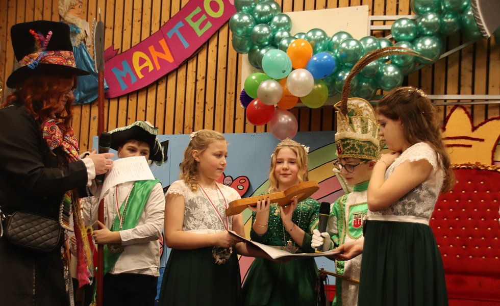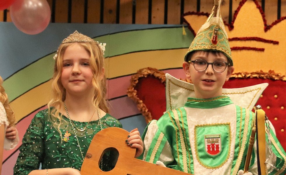 Nachdem das Kinderprinzenpaar Prinz Jannes, der trommelnde Entdecker, und Prinzessin Noelia, die Perle der Fröhlichkeit, von Schulleiterin Nadine Jochheim Schlüter symbolisch den Schulschlüssel überreicht bekamen, durften sie endlich „schalten und walten, weil sie den Schlüssel der Macht in den Händen halten“, wie Moderatorin Mia erklärte.