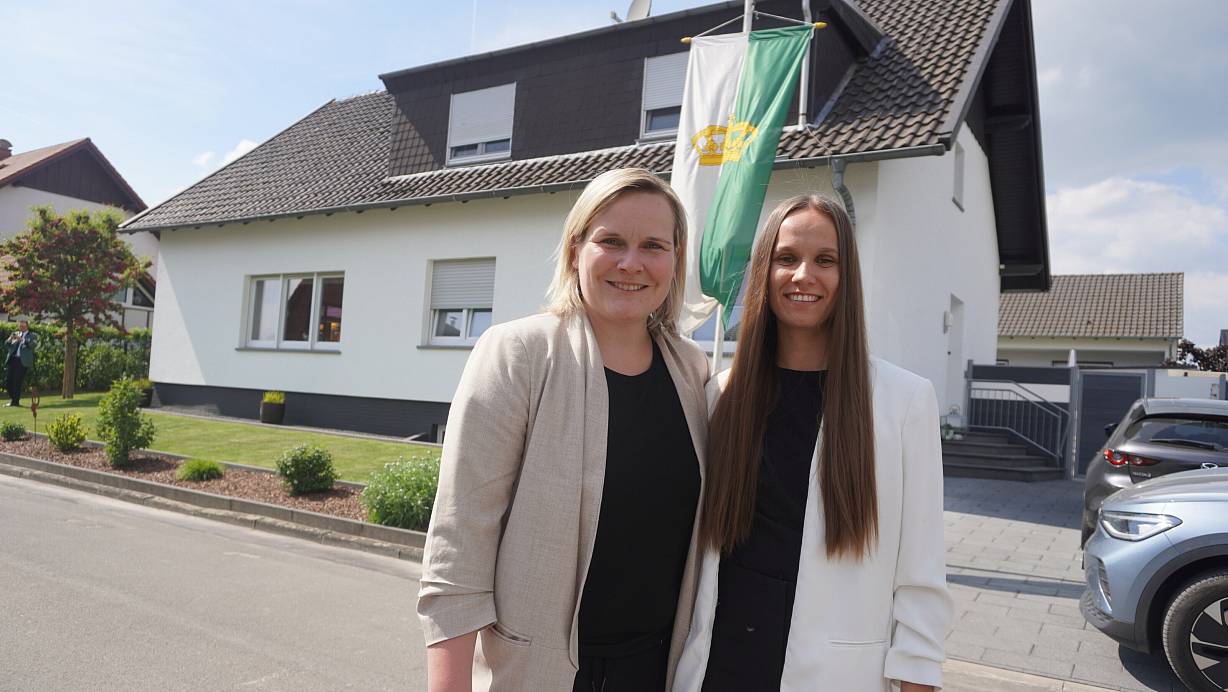 Die Fahne vor dem Königshaus ist gehisst: Schützenkönigin Luisa Wiechers und ihre Prinzessin Kerstin Milchberger freuen sich auf das bevorstehende Schützenfest. | © Michaela Weiße