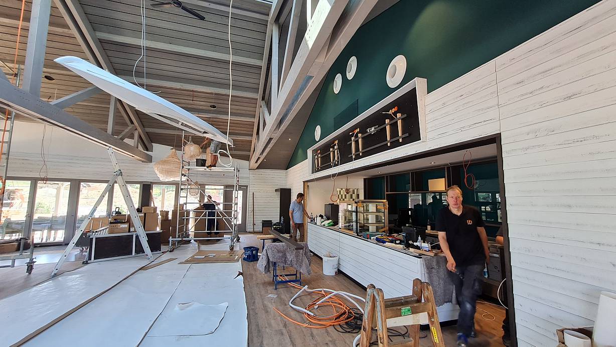 Ausgediente Kajaks dienen als Dekoelemente unter der Decke. Und auch wenn schon Tische und Stühle geliefert wurden, müssen alle Gewerke noch einiges hinkriegen - Elektrik inklusive. | © Marianne Schwarzer