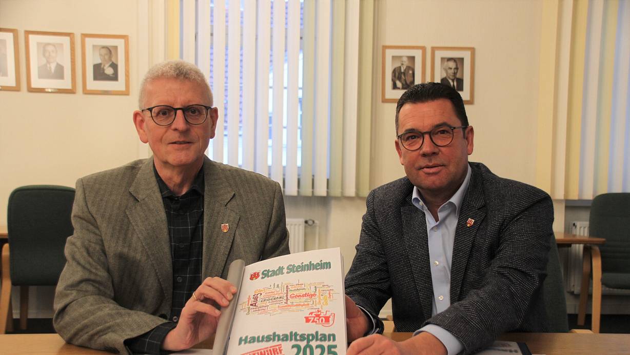 Kämmerer Hein-Josef Senneka und Bürgermeister Carsten Torke halten den Haushaltsplan 2025 in den Händen. Grund zur Freude bringt dieser nicht. | © Madita Schellenberg