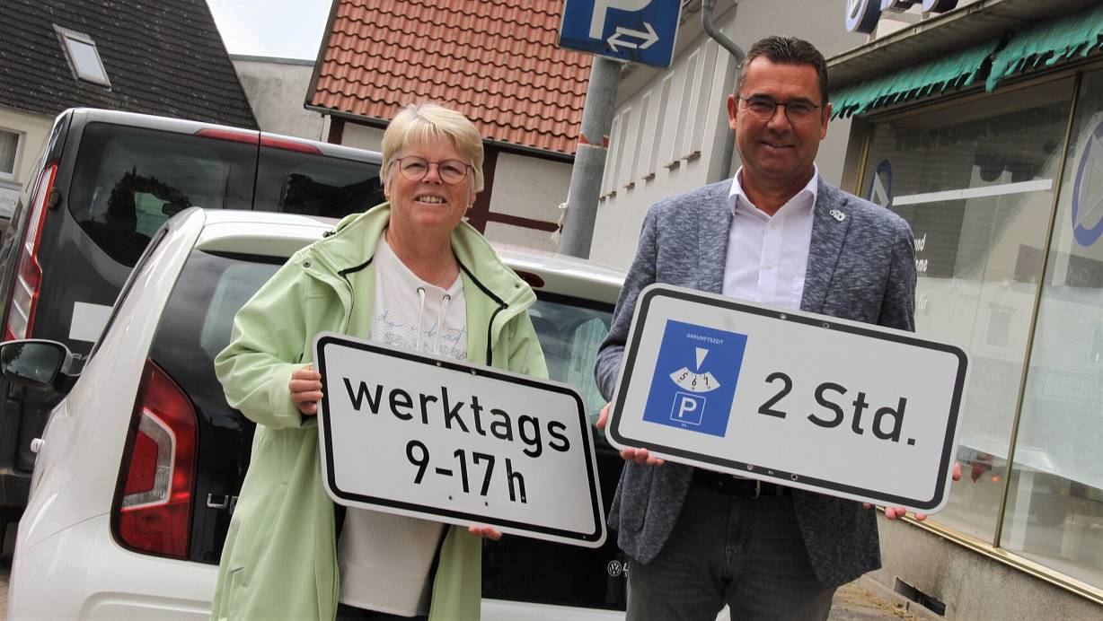 Die Schilder, die Anke Rüsenberg vom Steinheimer Ordnungsamt und Bürgermeister Carsten Torke hier in den Händen halten, sind durch die Neuregelung nun nicht mehr häufig zu finden. | © Madita Schellenberg