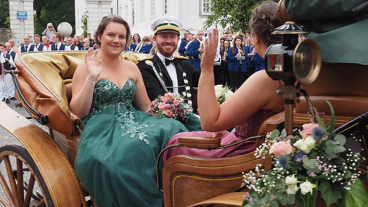 Mit einem strahlenden Lächeln zogen Königin Patricia Schäfers und König Sven Hülsmann mit der Kutsche in den Schlosshof ein. | © Josef Köhne