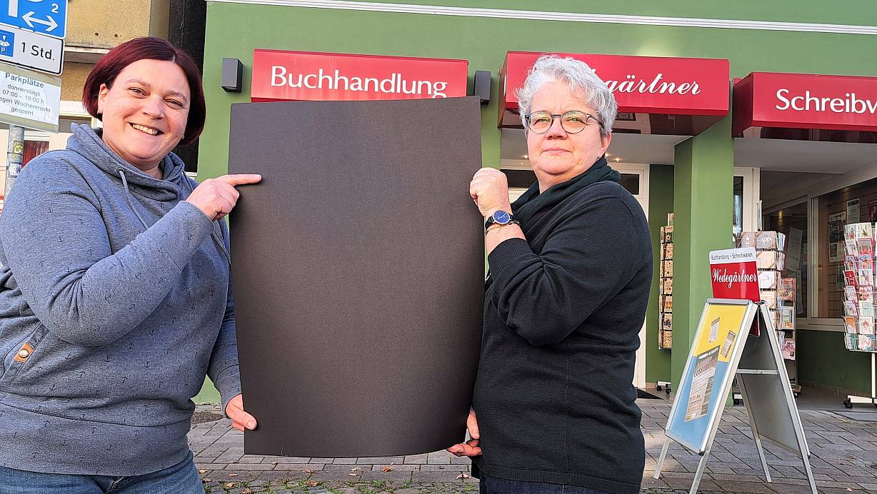 Tanja Lippe (l.) und Anne Fricke deuten schon mal an, wie das Schaufenster der Buchhandlung Wedegärtner in Steinheim bald für eine Aktionswoche lang aussehen wird: schwarz. | © Madita Schellenberg