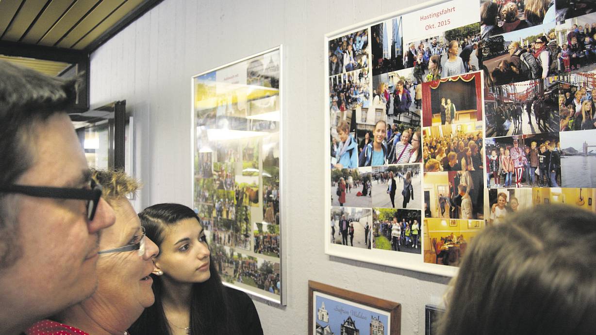 Blick nach Europa: Lehrer Carsten Götz (v. l.) und Lehrerin Ruth Kröger-Bierhoff zeigen Schülerin Laura Borchetta Fotos der Austauschprogramme. | © Ingo Kalischek