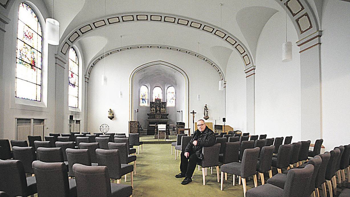 „Am 15. Dezember wird am Altar die erste Messe gefeiert", kündigt Pfarrer Andreas Wilke an, der auf einem der neuen Stühle in der Petri-Kapelle Platz genommen hat. Links vom Chorraum hängt die Pieta, die Darstellung der trauernden Gottesmutter, die den Leichnam ihres Sohnes in Händen hält, an der Wand, rechts ist der Heilige Josef mit der Zimmermannsaxt zu sehen. | © Dieter Scholz
