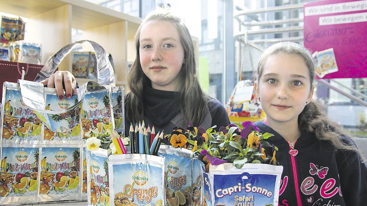 Mehr als nur Trinkpäckchen: Ricarda Koch (13, 7. Klasse) und Marie Menne (12, 6. Klasse) haben gemeinsam mit weiteren Schulkameraden aus alten Trinkpäckchen-Verpackungen Blumentöpfe, Taschen und Stifthalter gebastelt. | © Lena Vanessa Niewald