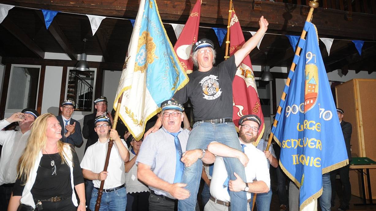 Jubel unter den Kompaniefahnen: Nach einem fast dreistündigen Wettbewerb präsentieren die Warburge Schützen ihren neuen Regenten. Sie lassen König Hans-Stefan Lütkemeyer hochleben. Zur Königin erkor er sich der 52-Jährige seine Lebenspartnerin Tatjana Hartwig (l.). | © Hubert Rösel