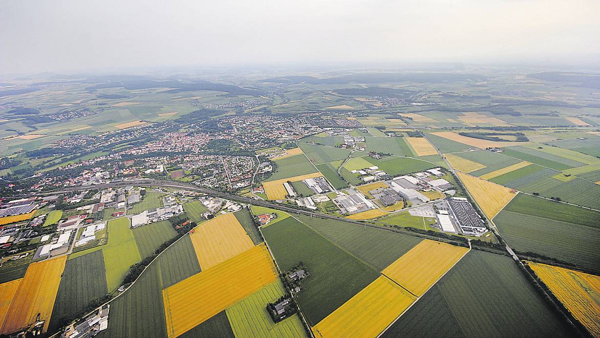 Im Visier: Rund 260 Hektar betrug die Fläche, die m ehemaligen Landesentwicklungsplan für flächenintensive Großprojekte vorbehalten war. Auf dem Areal nördlich der Bahngleise wird im kommenden Jahr zwischen dem Industriegebiet Nord (r.) und der Ostwestfalenstraße (l.) eine 5,4 Millionen Euro teure Anbindungsstraße gebaut werden (im Hintergrund ist die Stadt Warburg zu sehen). Dann könnten sich nach Vorstellung der Stadtverwaltung auf den heutigen Feldern auch Unternehmen neu ansiedeln. | © Davis Schellenberg