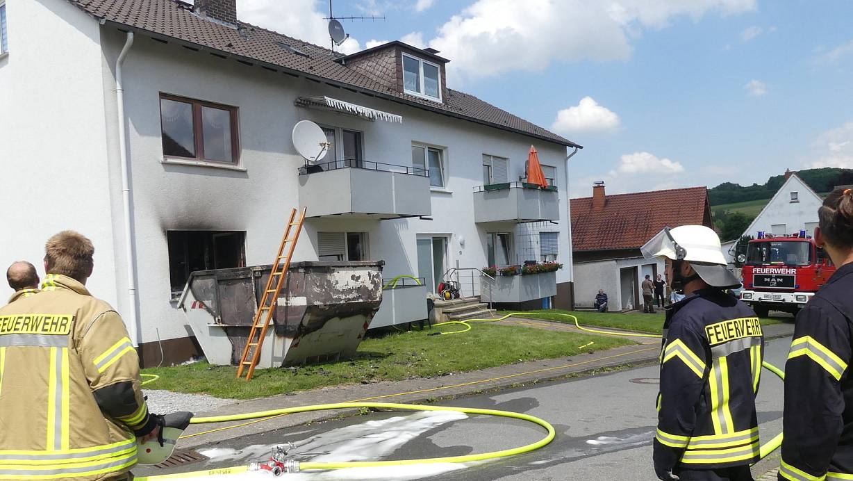 Im Einsatz: Aus dem Schuttcontainer vor einem Mahrfamilienhaus in Scherfde schlugen die Flammen. Eine Übergriff auf das Gebäude konnte die Feuerwehr verhindern. Ein Fensterkreuz im Erdgeschoss hatte bereits Feuer gefangen. | © Hubert Rösel