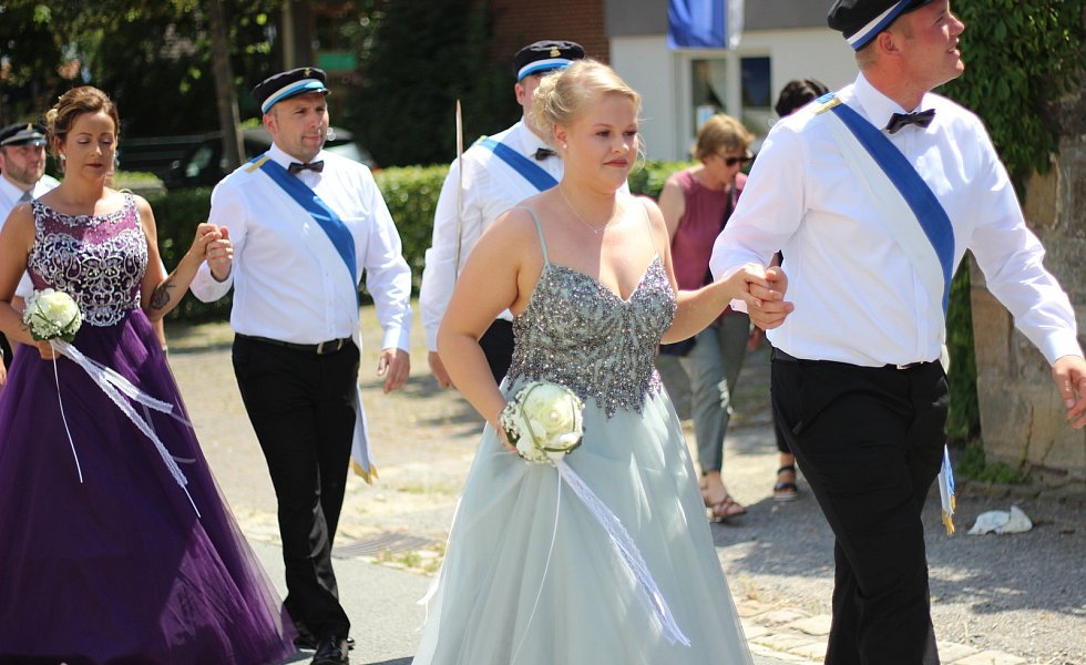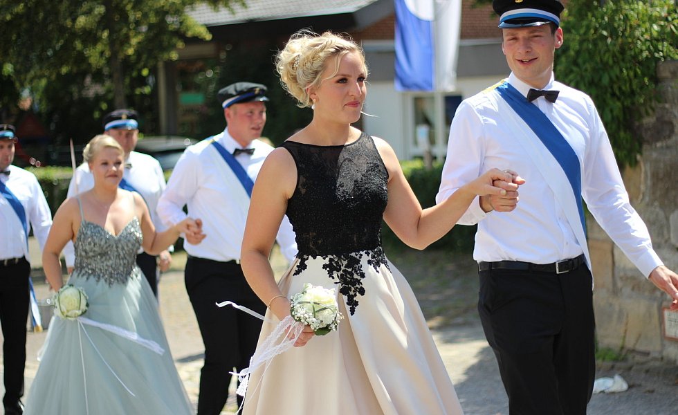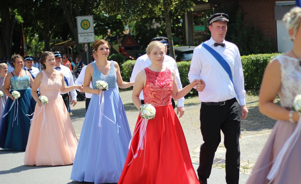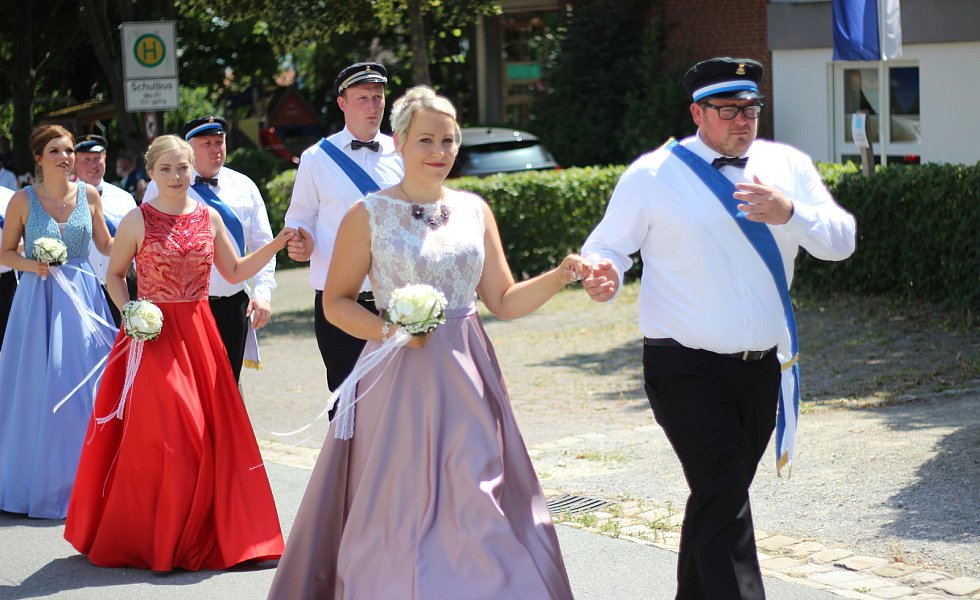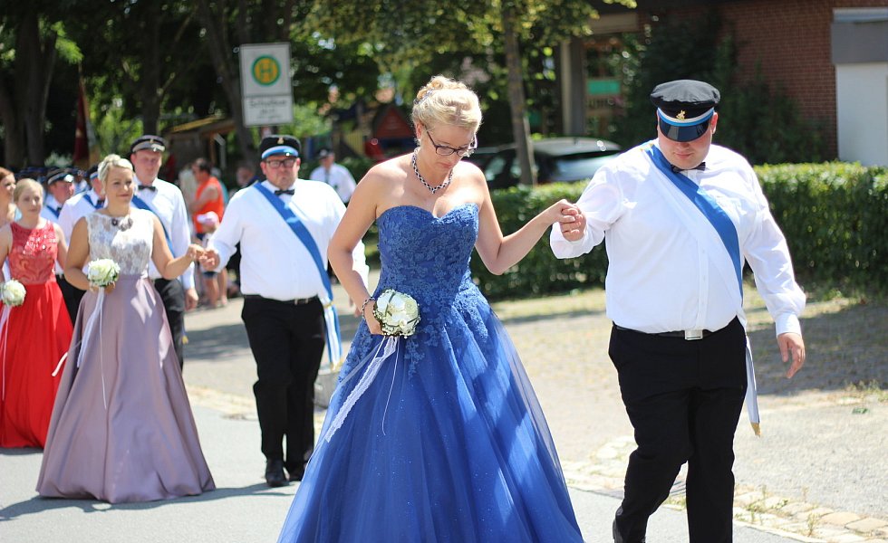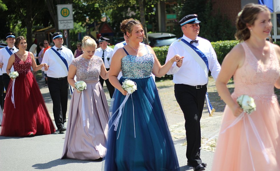 Ein Jammer, denn sowohl das Kleid der Königin als auch die Kleider der Hofdamen waren des Jubels mehr als würdig. Königin Sabrina Döhne verzauberte das Schützenvolk am Nachmittag in einer weit ausgestellten rosafarbenen Prinzessinnenrobe mit einzigartigen Volants am Rock. Auch das Oberteil des aufwendig gearbeiteten Kleids war mit seinem Spitzenbesatz mehr als sehenswert. Der Umzug wurde aufgrund der hohen Temperaturen etwas verkürzt. Beim Königsschießen Marc Oppermann nach spannendem Schießen mit dem 21. Schuss die Königswürde.
