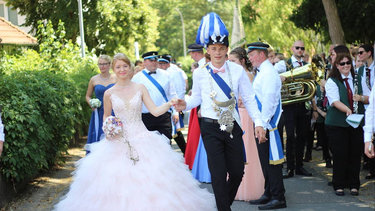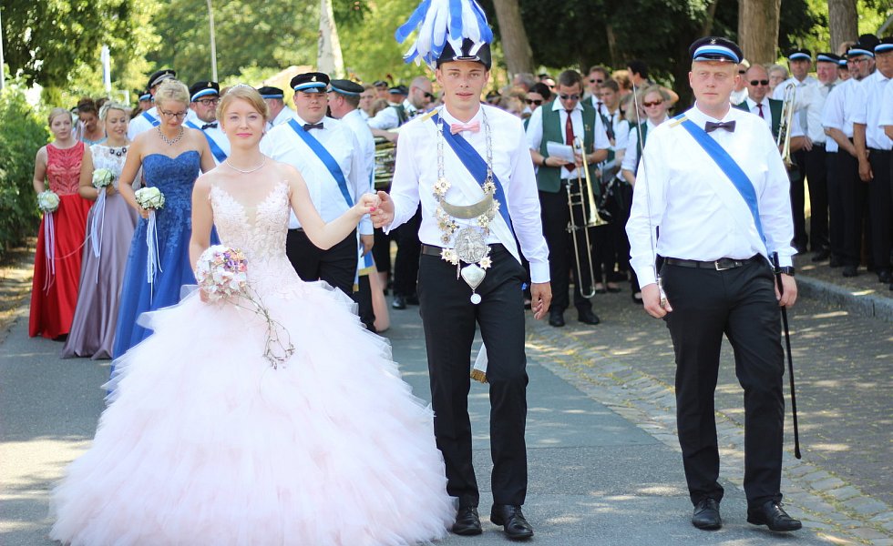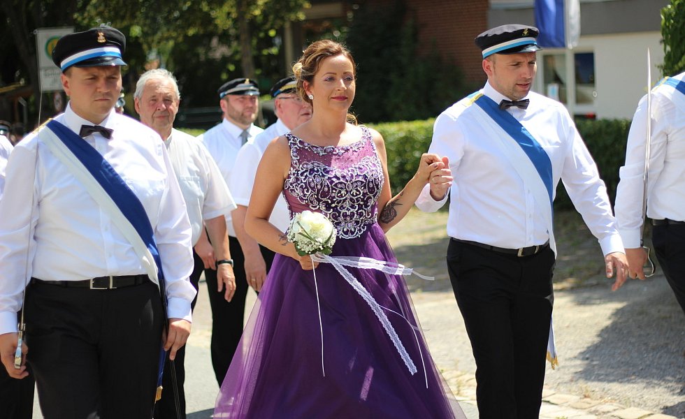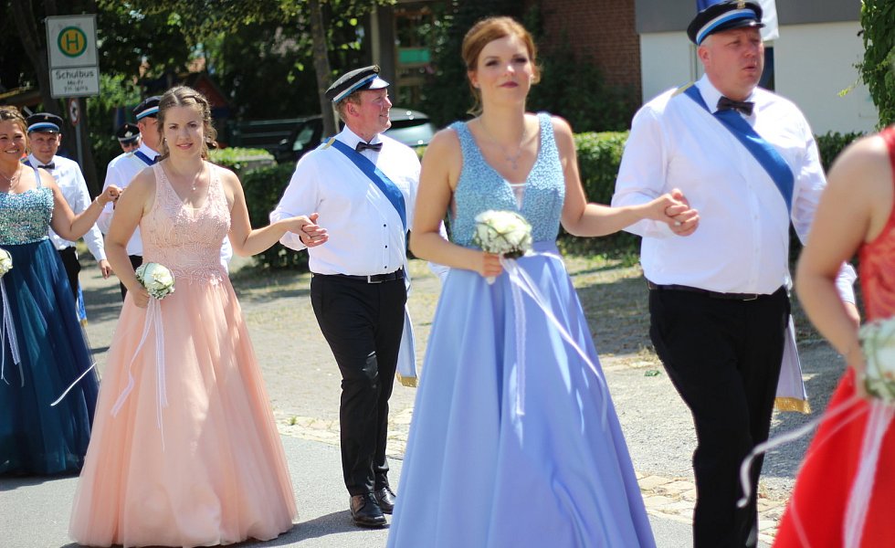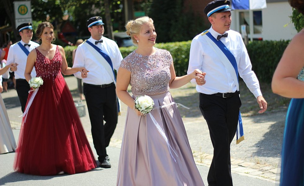 Ein Jammer, denn sowohl das Kleid der Königin als auch die Kleider der Hofdamen waren des Jubels mehr als würdig. Königin Sabrina Döhne verzauberte das Schützenvolk am Nachmittag in einer weit ausgestellten rosafarbenen Prinzessinnenrobe mit einzigartigen Volants am Rock. Auch das Oberteil des aufwendig gearbeiteten Kleids war mit seinem Spitzenbesatz mehr als sehenswert. Der Umzug wurde aufgrund der hohen Temperaturen etwas verkürzt. Beim Königsschießen Marc Oppermann nach spannendem Schießen mit dem 21. Schuss die Königswürde.