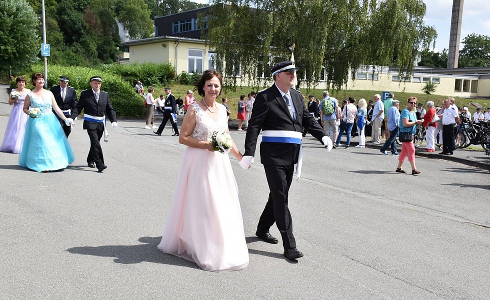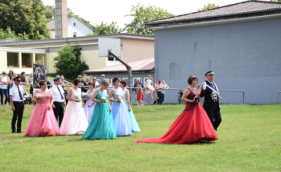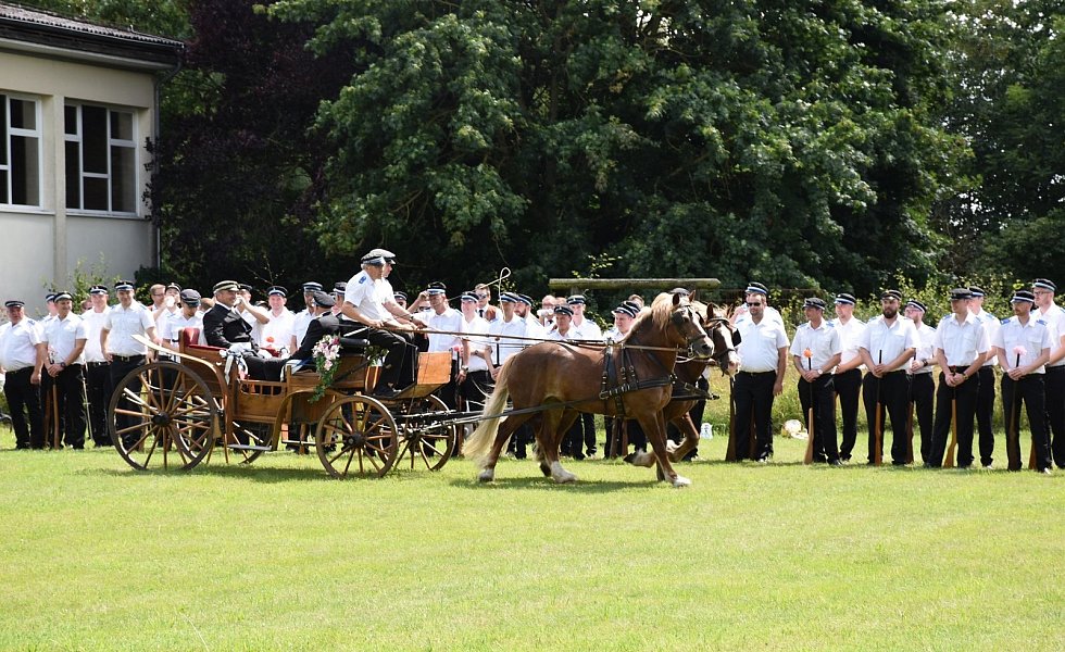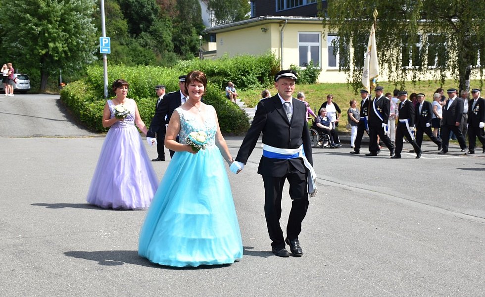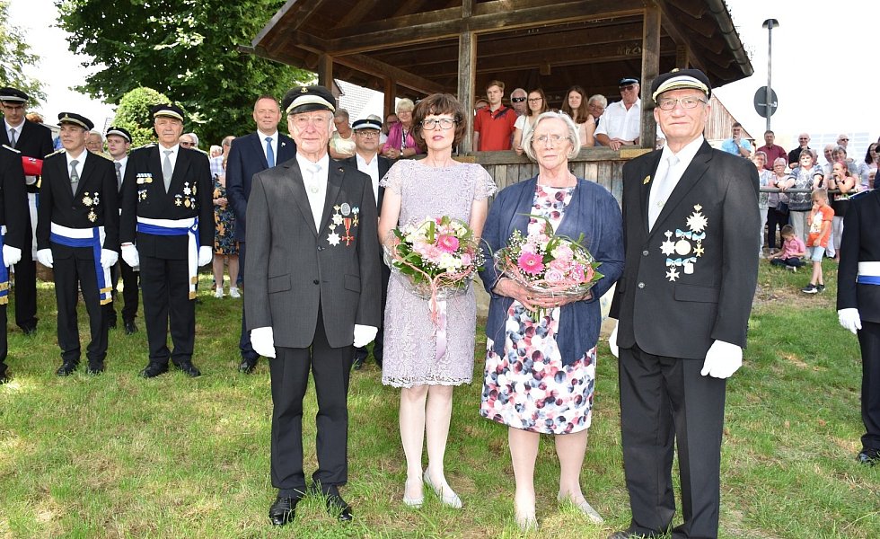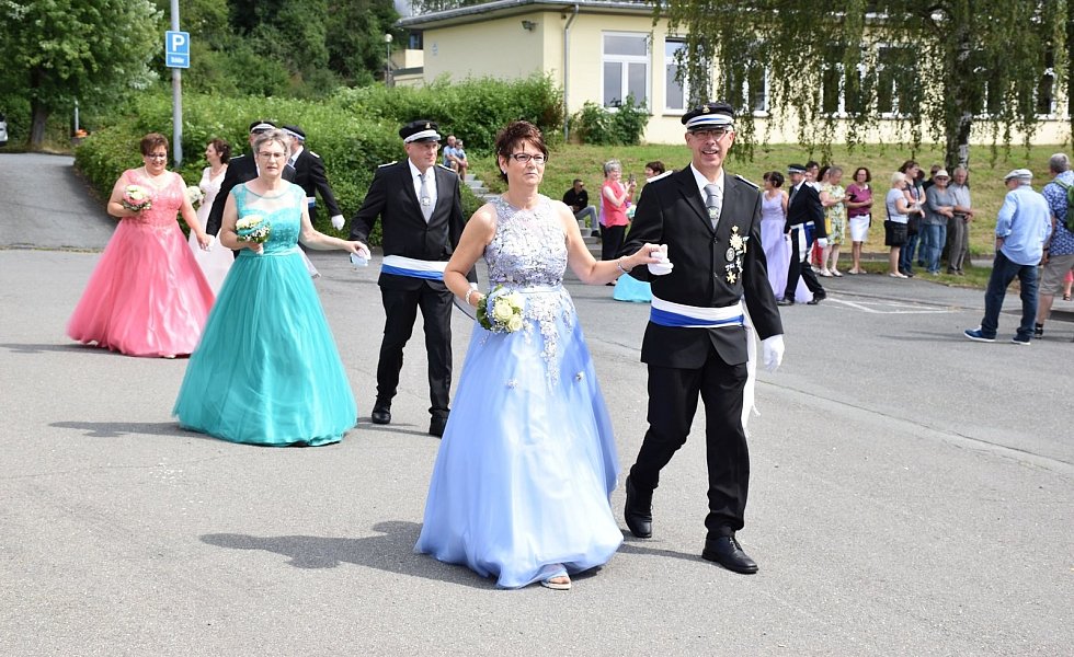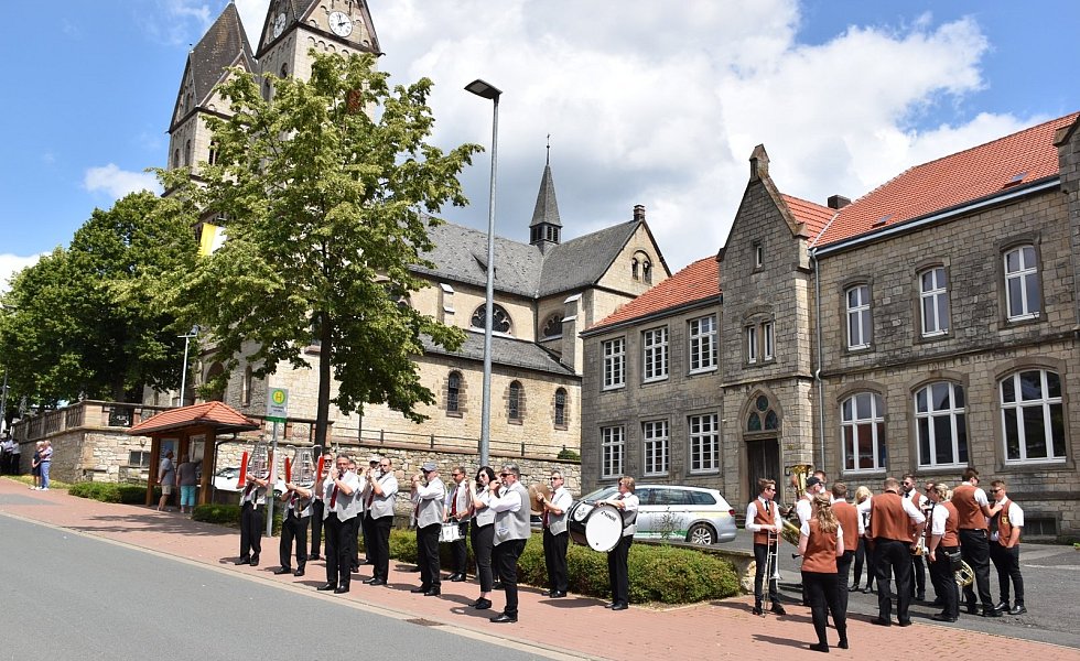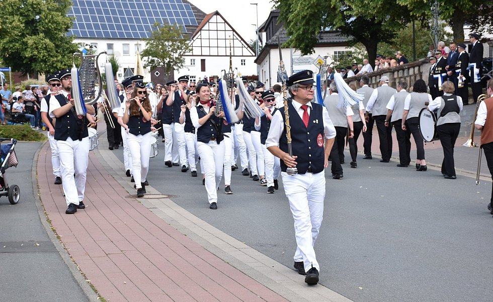 Nach der Krönung und der Ehrung der Jubelkönigspaare, die in der Kutsche Platz nahmen, bewegte sich der Festumzug durch die Straßen Rimbecks, begleitet von den Musikvereinen Rimbeck und Ossendorf sowie den Spielmannszügen aus Bonenburg und Wrexen.