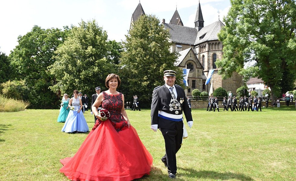 Warburg-Rimbeck. Begeisterte Jauchzer entfuhren den Besuchern am Rimbecker „Diemeldom", als eine zweispännige Kutsche am Sonntagnachmittag über den Krönungsplatz fuhr. Darin saß Hubert Hoppe, der vor einer Woche mit dem 106. Schuss beim Königsschießen den Vogel von der Stange geholt hatte, und nun zu seiner Krönung kam.