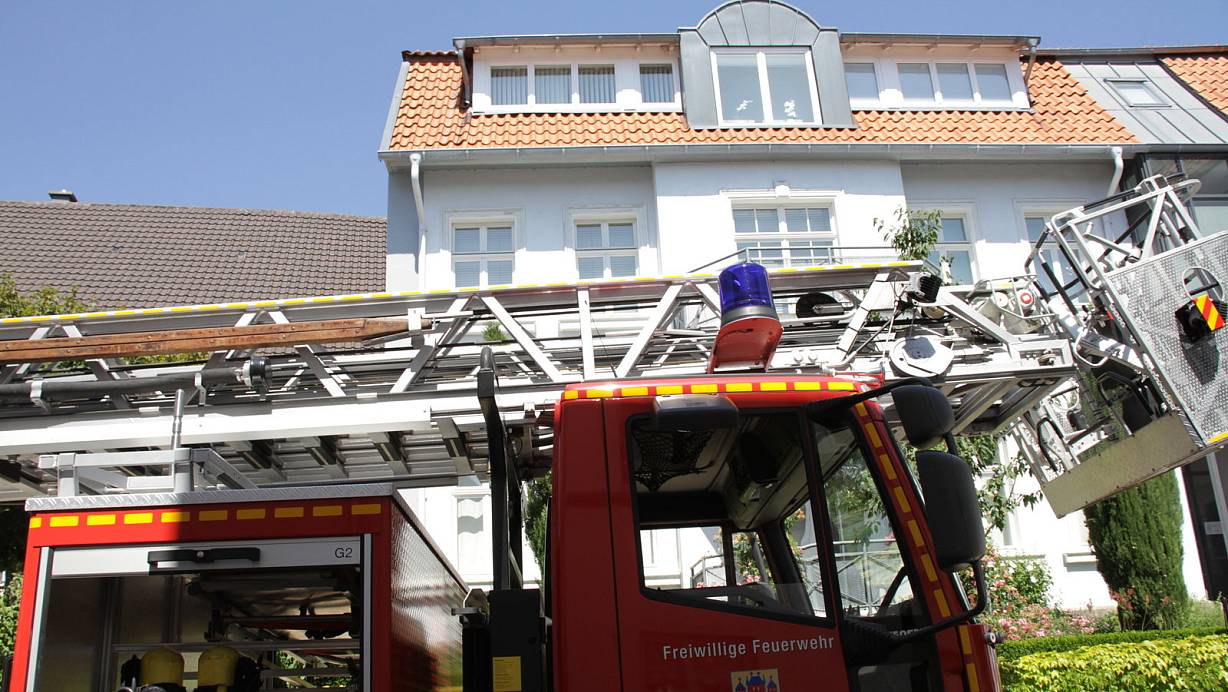 Einsatz an der Sternstraße: Unter der Dachtraufe hatt sich am Gebäude ein Mauersegler verfangen. Mit Hilfe der Drehleiter befreite die Feuerwehr den Vogel aus seiner misslichen Lage. | © Dieter Scholz