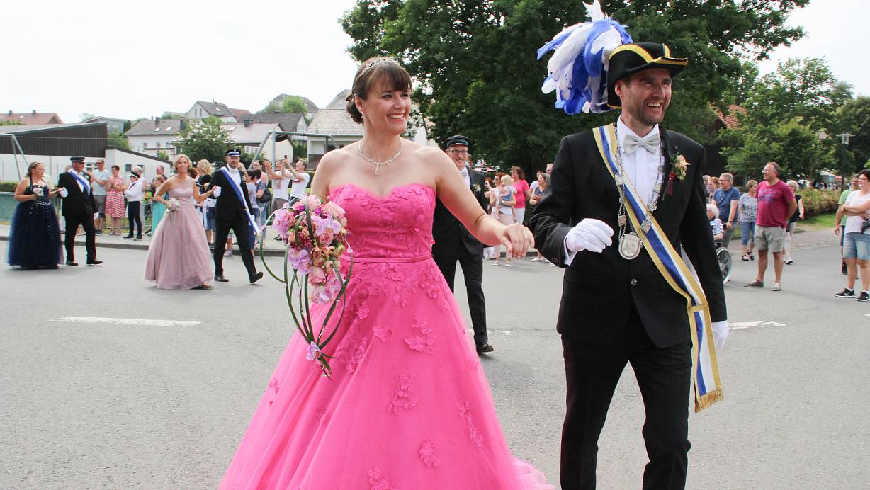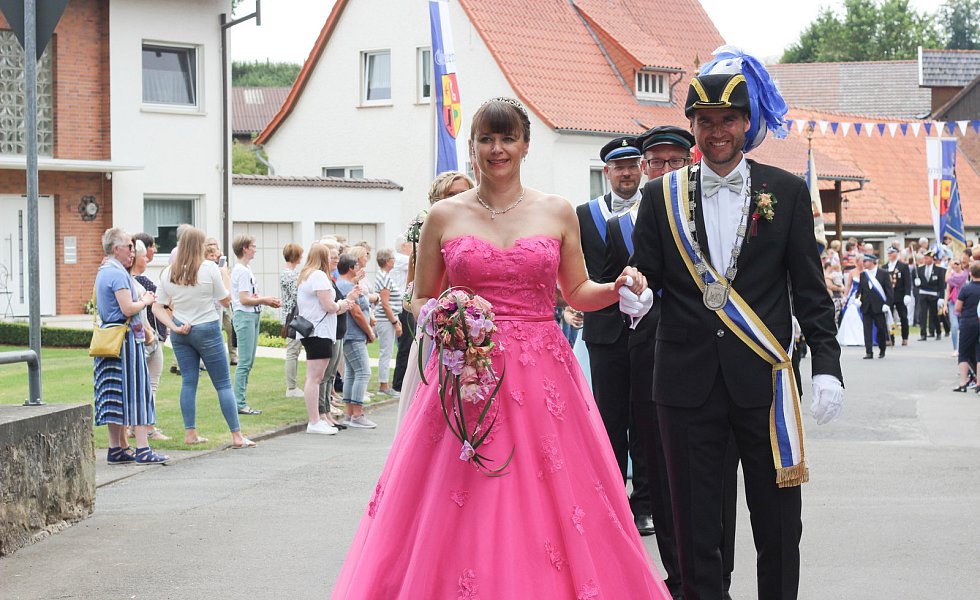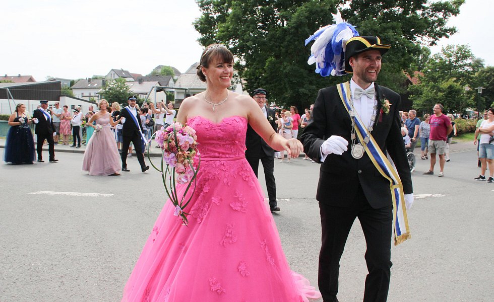 Und die wartende Menge wurde nicht enttäuscht: Die 40-jährige Königin beeindruckte die Schaulustigen mit einem himbeerfarbenen Königinnenkleid mit eleganter Spitze. Die Königin ist als Berufsschullehrerin in Hameln tätig, ihr 43-jähriger König ist Privatkundenberater bei der Vereinigten Volksbank in Nieheim. Mit der Regentschaft tritt die Königin in die Fußstapfen ihrer Eltern, die vor 40 Jahren in Calenberg das Königszepter schwangen.