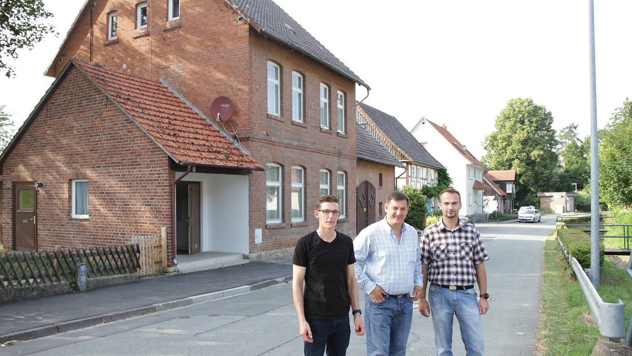 Vorstandsteam: Kassierer Moritz Pfannkuche (v. l.), stellvertretender Vorsitzender Dietmar Beyhl und Vorsitzender André Flore vor der ehemaligen Schule im Dorf. | © Dieter Scholz