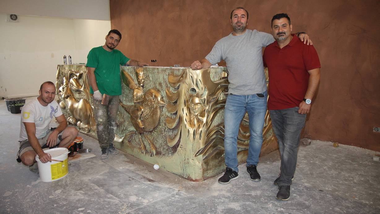 Eifrig arbeiten Trockenbauer Adrian Paveliuc (v. l.), der Raumgestalter und Künstler Sulo, Inhaber und Koch Don Pepe und Nico Balan am Umbau eines Modeladens  zu einer Brasserie. | © Hermann Ludwig