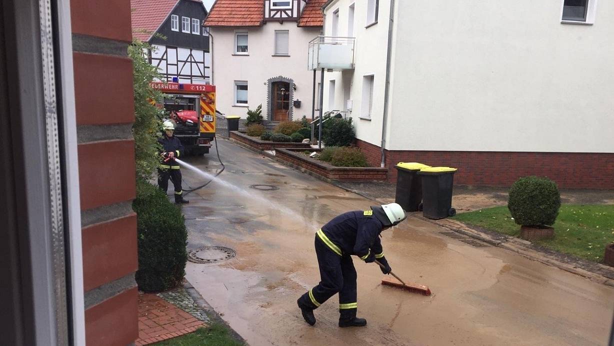 Untere Dorfstraße in Wormeln: Feuerwehrleute reinigen am Morgen die Fahrbahn. | © Tobias Branke