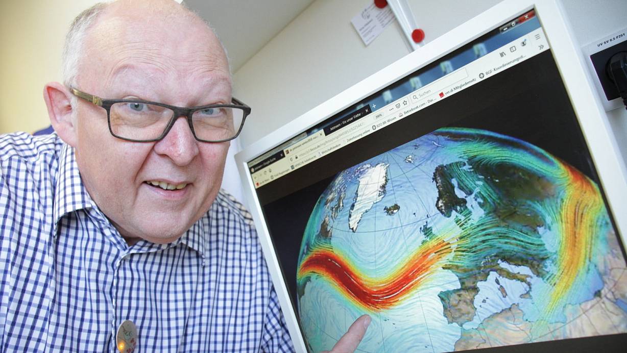Bernhard Michels hat auf dem Monitor eine Seite aufgerufen, die den Verlauf des Ausgleichswinds zwischen dem Äquator und den Polen zeigt.  | © Dieter Scholz