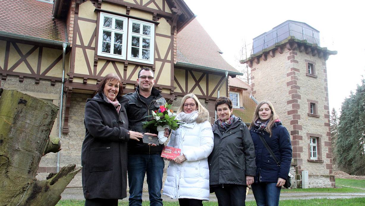 Kristin Wichert (v. l.), Matthias Wilmes, Jutta Dewenter sowie Renate Ortner und Iliana Felle vor dem historischen Forsthaus mit seinem Wasserturm. | © Burkhard Battran
