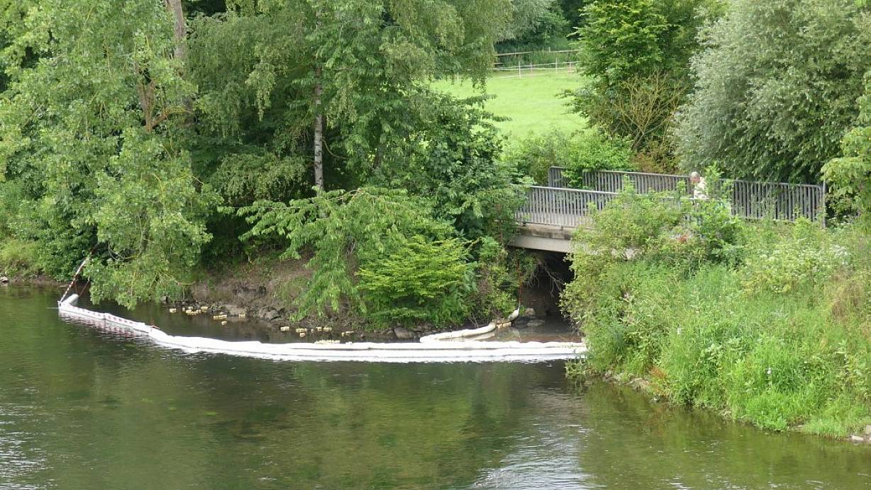 Übel riechendes  Öl am Einlauf des Siekbachs in die Diemel im Juli. Die Feuerwehr hat an der Radweg-Brücke Ölsperren angelegt.  | © Hubert Rösel
