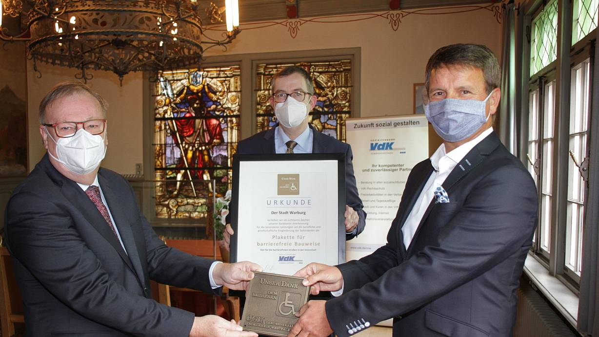 Eine Premiere im Kreis Höxter: Mit der Plakette „Unser Dank dem Bauherrn“ zeichnet der Landesverband des VdK die Umgestaltung der Warburger Innenstadt aus.