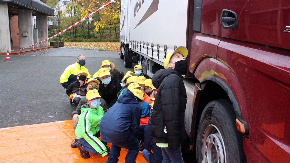 Viertklässler der Grundschule in Scherfede erleben besonders anschaulich, welche Gefahren sich im toten Winkel eines Lastzugs verbergen.