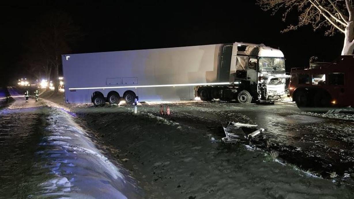 Auf schneeglatter Fahrbahn hat der Fahrer die Kontrolle über den Sattelschlepper verloren. Das Fahrzeug prallte gegen ein Baum, der Fahrer erlitt schwere Verletzungen. | © LZ Peckelsheim