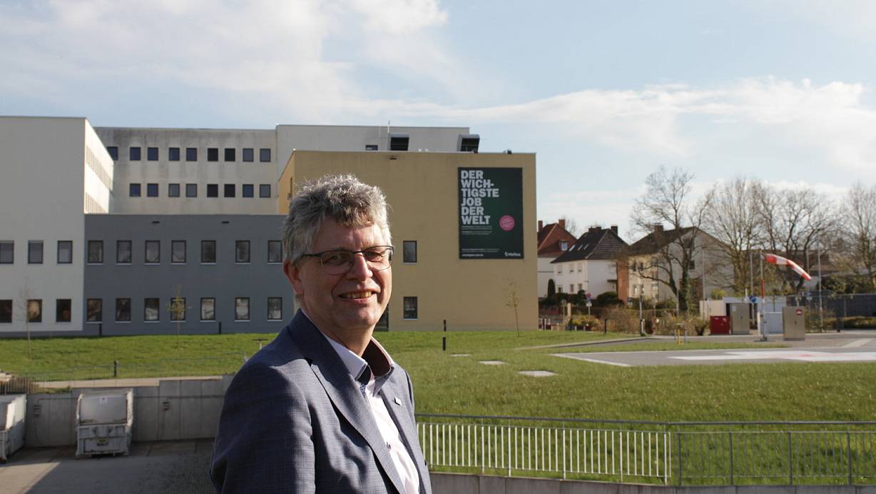 Bundestagsabgeordneter Christian Haase (CDU) vor dem Warburger Krankenhaus. An der Fassade der Helios-Klinik wirbt ein riesiges Plakat für den „wichtigsten Job der Welt". | © Dieter Scholz