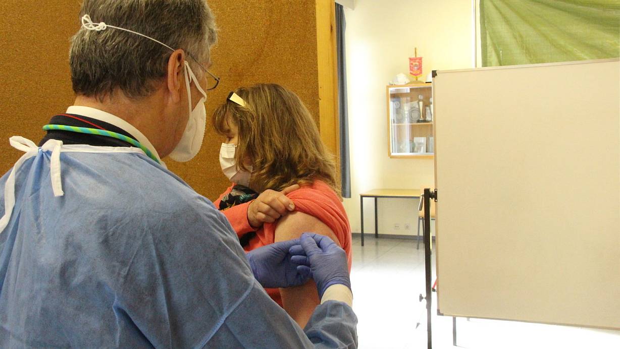 THW-Helferin Marion Böttcher erhält von Mediziner Albert Götte ihre Coronaschutzimpfung – in vier Wochen wird sich der komplette Vorgang noch einmal wiederholen. | © Burkhard Battran