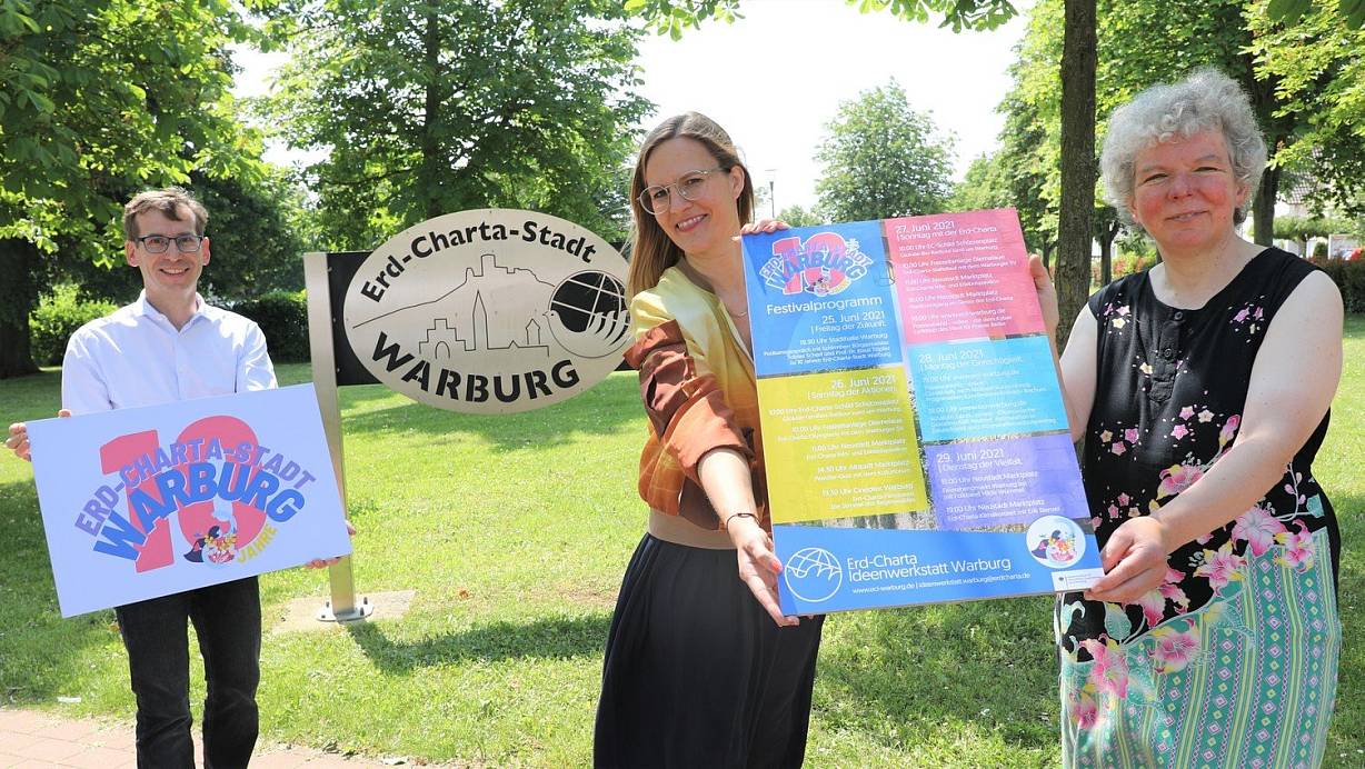 Schirmherr und Bürgermeister Tobias Scherf (v. l.) mit dem Logo des Festivals sowie Ideenwerkstatt-Koodinatorin Valeria Geritzen und Erd-Charta-Botschafterin Dagmar Feldmann mit dem Programm des fünftägigen Events in Warburg. | © Simone Flörke