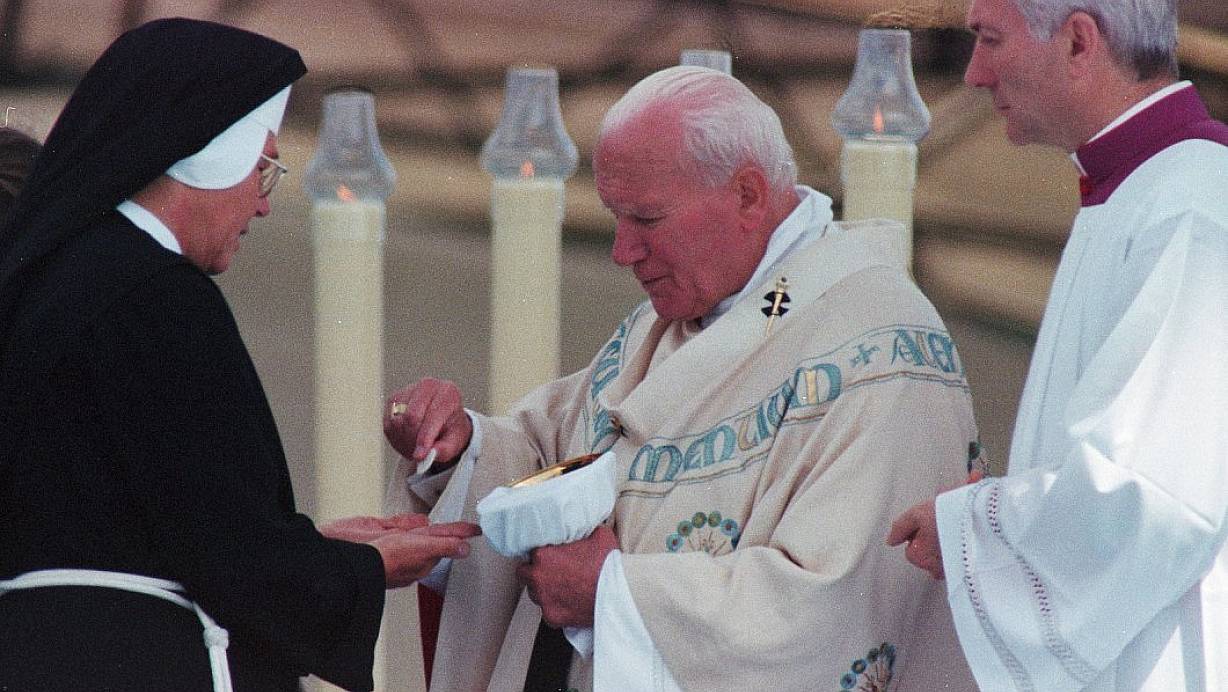 Gottesdienst in der Senne: Johannes Paul II. legt die Hostie in die Hände einer Nonne. | © Reinhard Rohlf