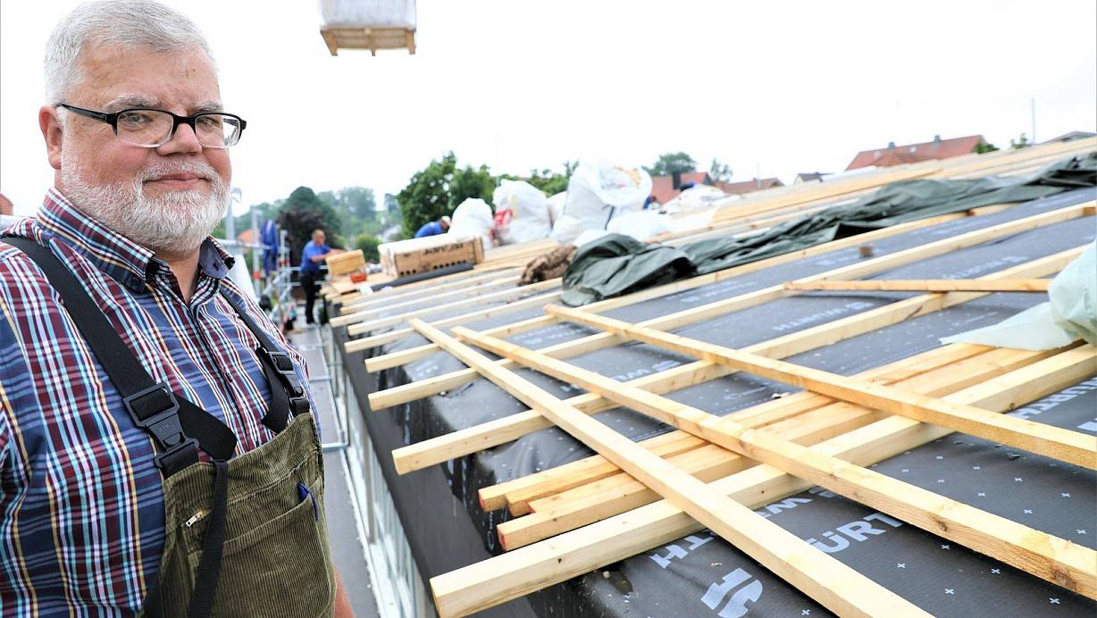 Uwe Ahlemeyer auf dem Dach der Holsterbachhalle, wo die Handwerker bei der Arbeit sind. | © Simone Flörke