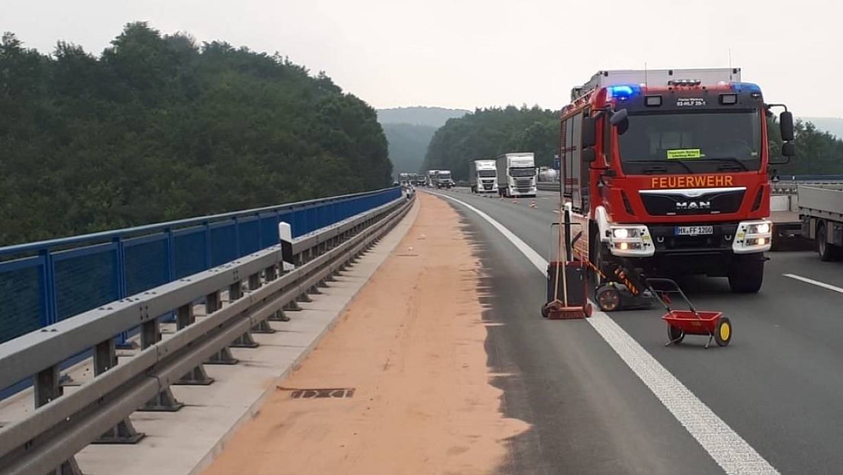 Auf einer Strecke von rund drei Kilometern brachten die Einsatzkräfte letztlich ganze 72 Säcke Bindemittel aus, um den Ölfilm abzubinden. Das Granulat wurde dann anschließend mit der Kehrmaschine der Autobahn GmbH aufgenommen. Die Feuerwehr kontrollierte zusätzlich die Regeneinläufe auf mögliche Verschmutzungen durch das Betriebsmittel. Während der gut sechs Stunden andauernden Reinigungsarbeiten war die rechte Fahrspur des betroffenen Autobahnabschnitts gesperrt.