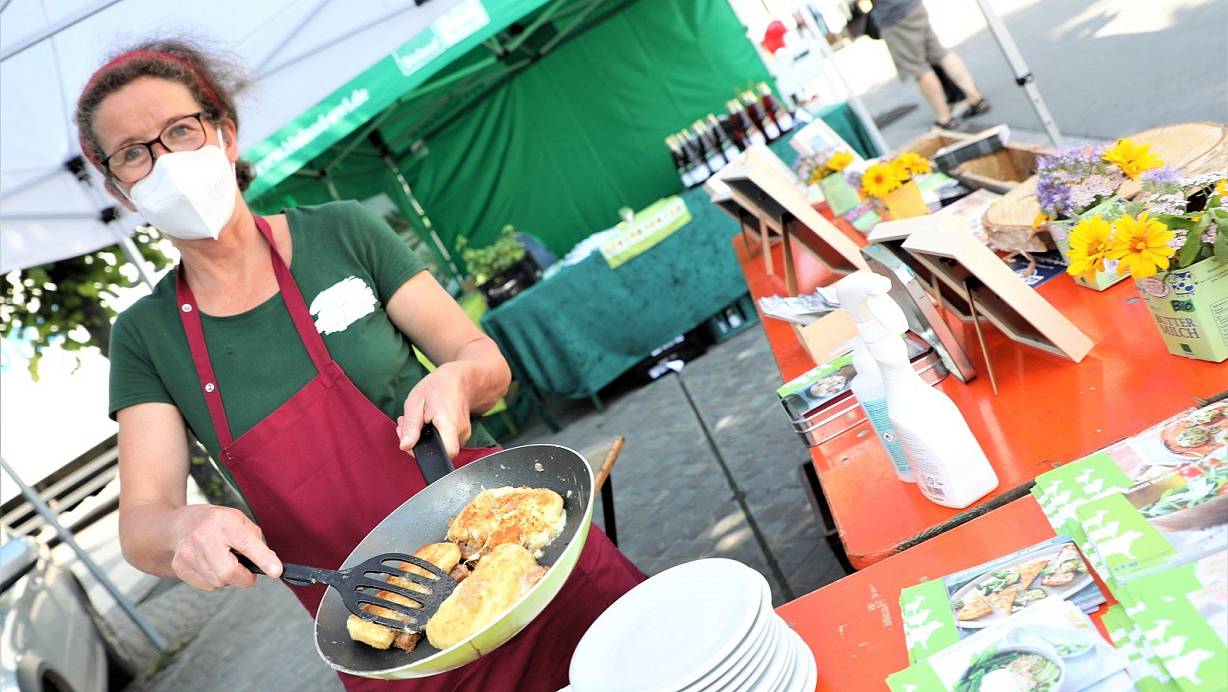 Kulinarisches mit Bratmozzarella zauberte Heike Schäfer-Jacobi in der Pfanne am Stand auf dem Neustadtmarktplatz. | © Simone Flörke