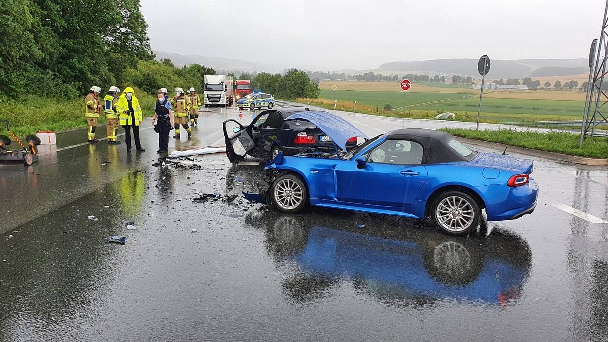 Die beiden Fahrzeuge blieben nach der Kollision mitten auf der Fahrbahn der Bundesstraße 252 stehen. | © FFW Warburg