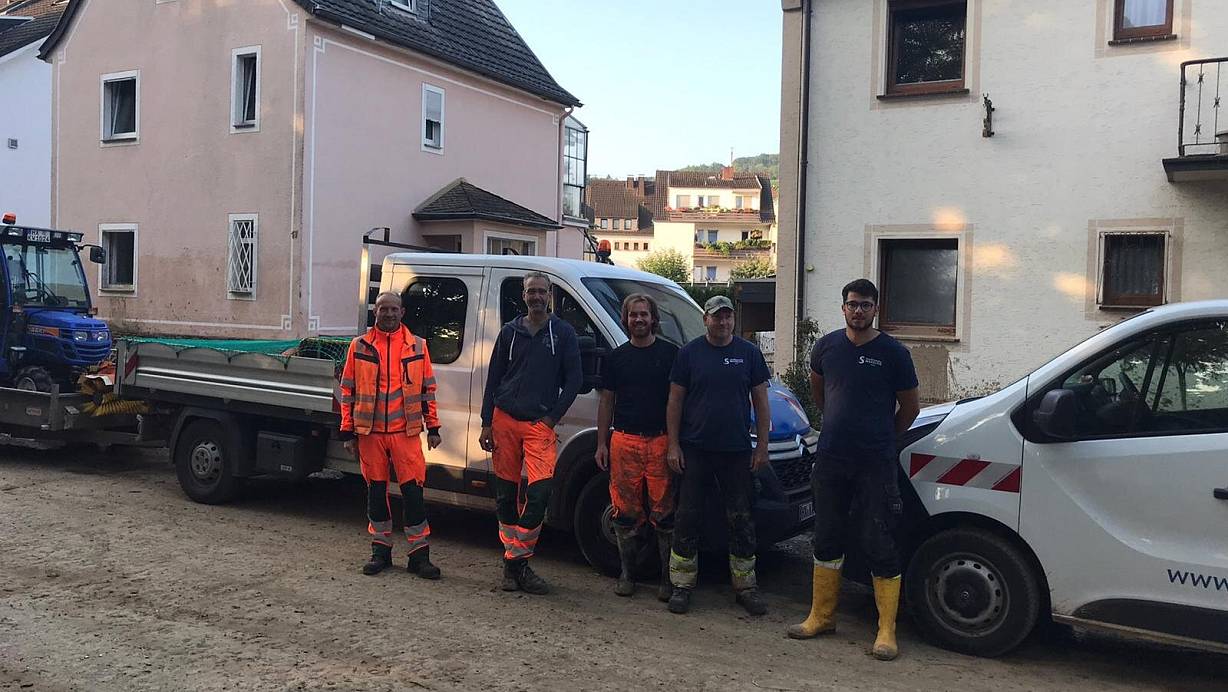 Dominik Emmerich (v. l.), Thomas Pfeiffer, Gero Langguth, Thomas Orth und Jonathan Neunteufel sind im Katastrophengebiet im Einsatz. | © Stadtwerke Warburg