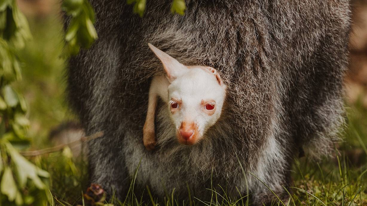 Bereits seit 31 Jahren werden im Tierpark Sababurg Bennettkängurus gehalten und Nachwuchs gibt es fast jedes Jahr, doch ein Albino-Känguru war noch nie mit dabei. Statt eines graubraunen oder rotbraunen Felles, wie es auch das ältere Jungtier trägt, das Känguru-Weibchen „Emma“ Anfang des Jahres zur Welt gebracht hatte, ist das gesamte Fell einschließlich der Augenwimpern weiß.