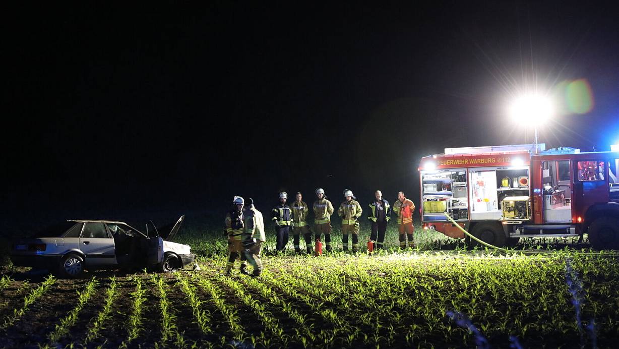 Das Auto war um 180 Grad gedreht auf einem Maisfeld fernab der Straße zum Stehen gekommen. Die Feuerwehr kümmerte sich um die Bergung. | © Simone Flörke