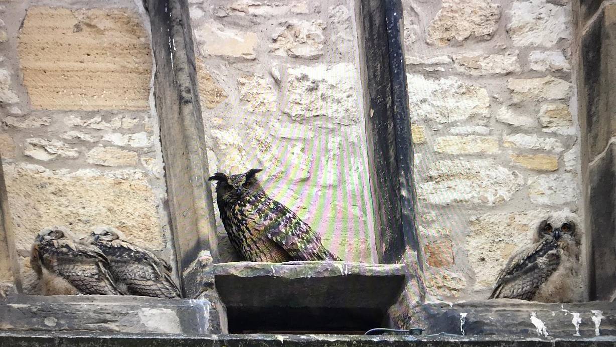 Vorwitzige Jungspunde: Uhu-Nachwuchs am Turm der Neustadtkirche in Warburg