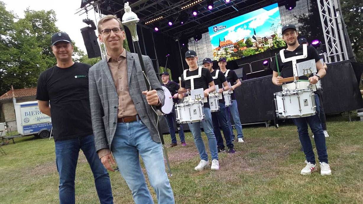 Olaf Krane, Dirigent des Stadt- und Jugendorchesters (v. l.), Bürgermeister Tobias Scherf und die Drum-Band. | © Dieter Scholz