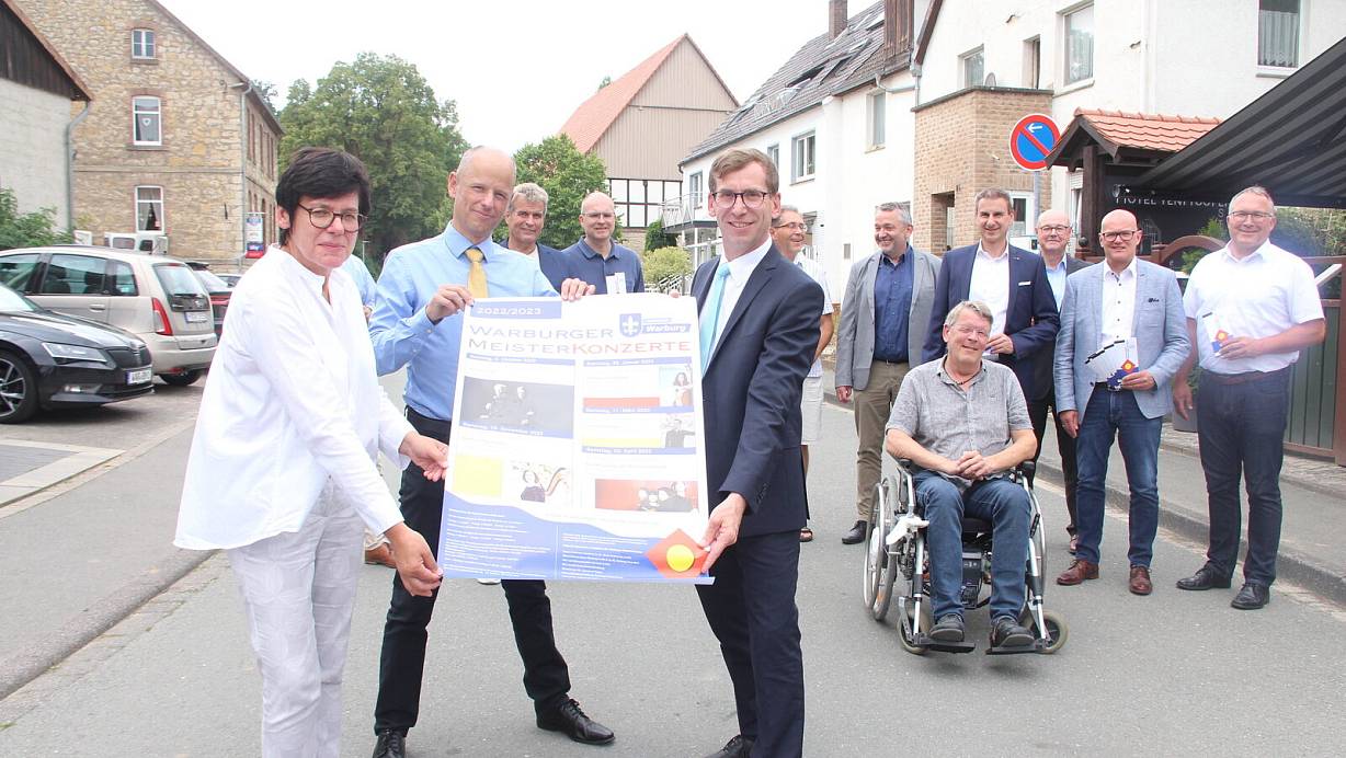 Organisatorin Sabine Laudage (v. l.) , Künstlerischer Leiter Peter Ernst und Bürgermeister Tobias Scherf sowie Sponsoren und Beiratsmitglieder präsentieren die neue Meisterkonzert-Saison. | © Burkhard Battran