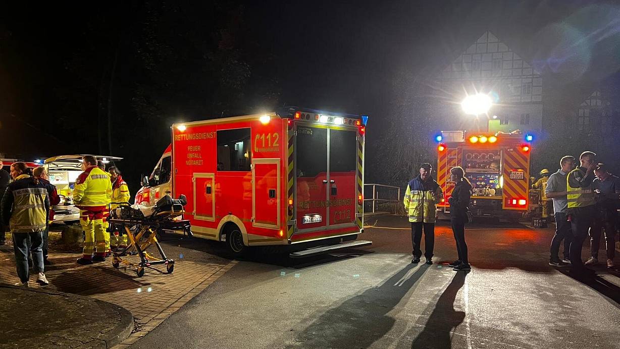 Einsatzkräfte der Feuerwehr aus der Ossendorfer Löschgruppe beleuchten an der Heinberghall den Platz der eintrefffenden Rettungsfahrzeuge. | © FFW Warburg