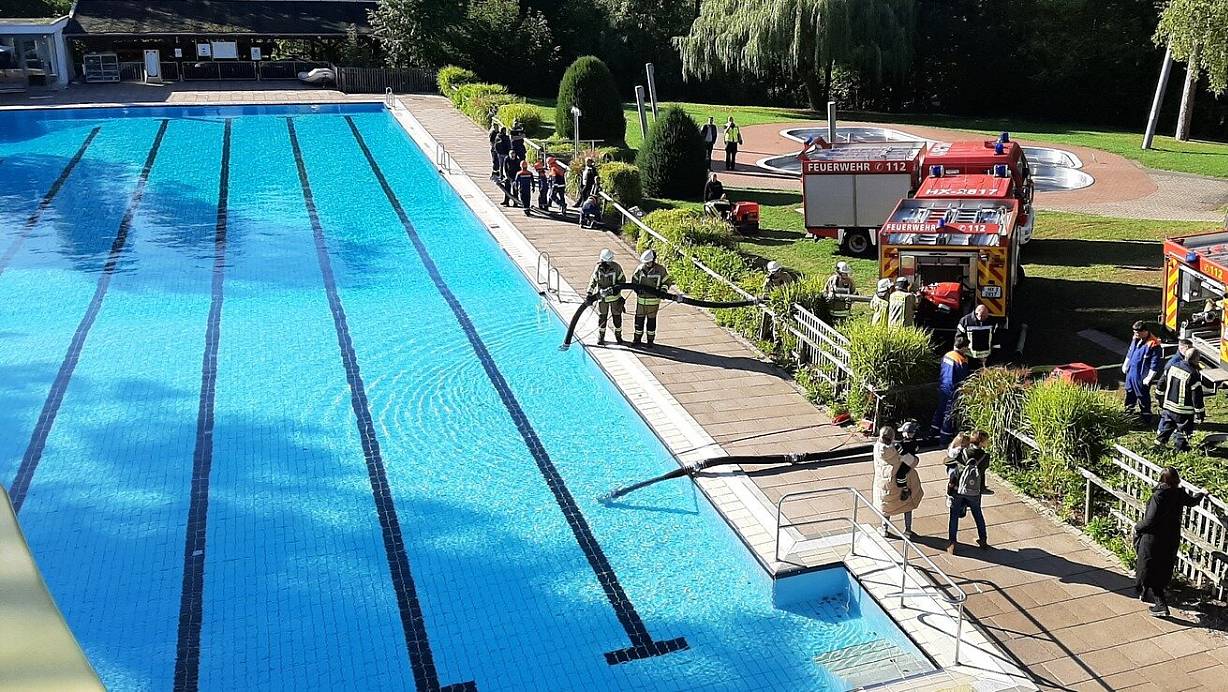 Die Freiwilligen Einsatzkräfte aus dem Stadtgebiet pumpen das Wasser aus dem Freibad ab und nutzen es bei der Simulation eines Waldbrandes. Dabei engagiert sich auch der Nachwuchs.