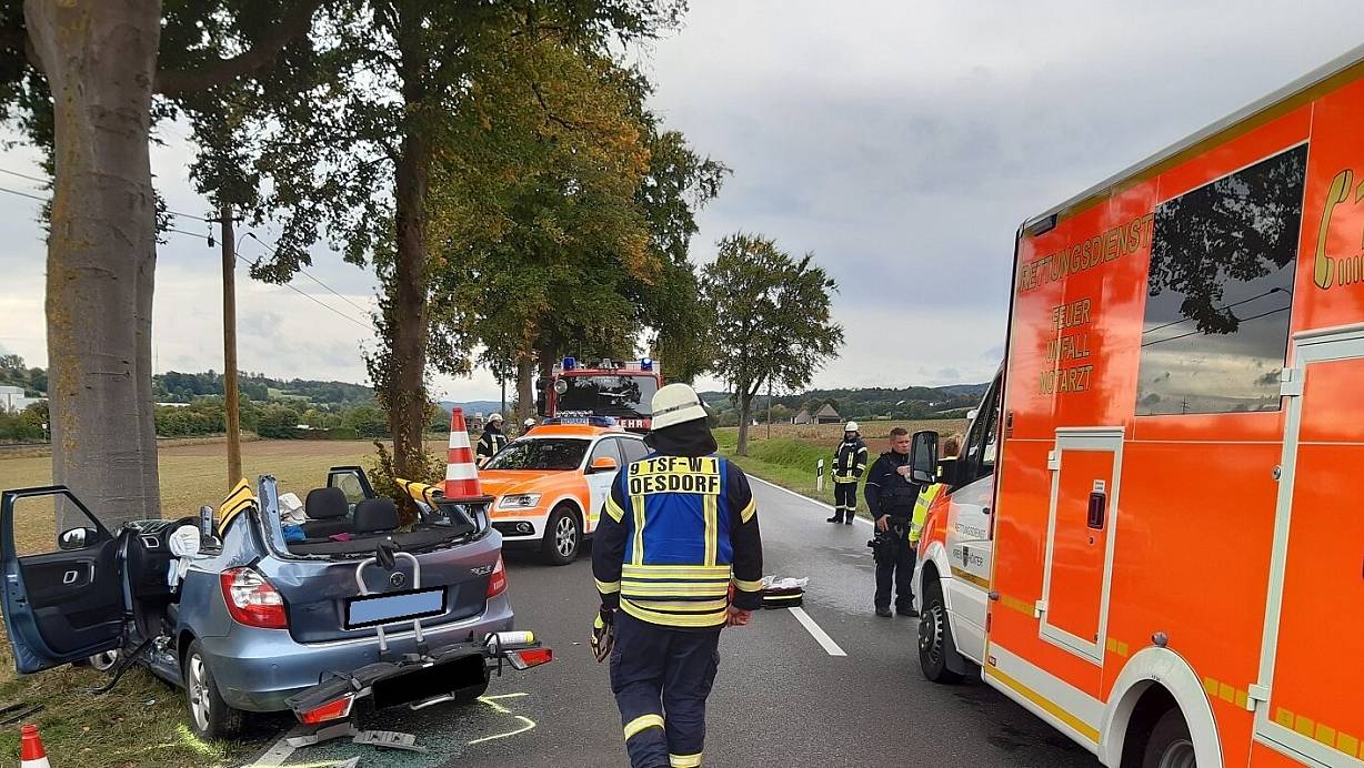 Die ersten Einsatzkräfte vor Ort konnten schnell feststellen, dass zwei Personen in ihrem Pkw eingeklemmt waren, der vor einen Baum gefahren war. Beide waren ansprechbar und stabil. Weitere Verletzte gab es nicht.