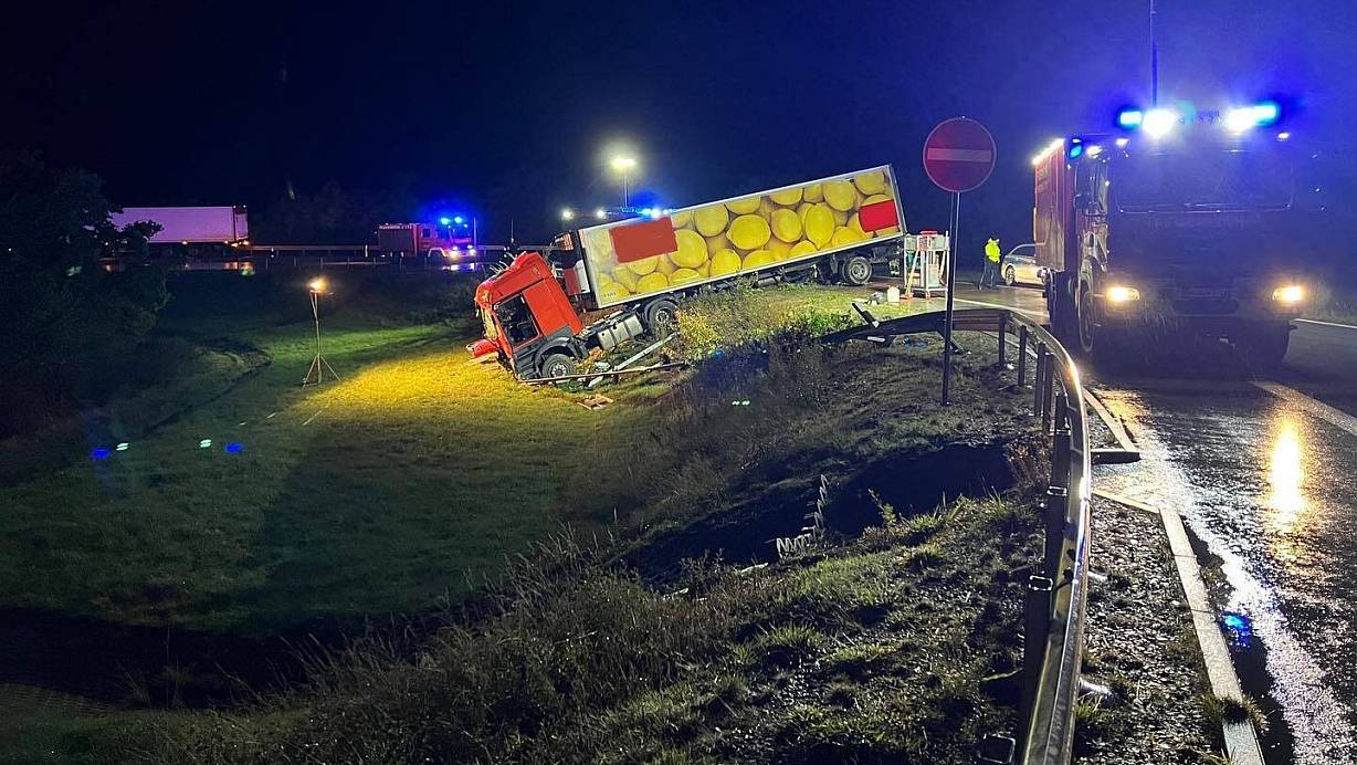 Aus bislang ungeklärter Ursache kommt der Lkw in der Nacht bei Warburg von der Fahrbahn ab.