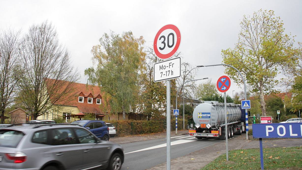 An der Landfurt weist ein Verkehrsschild die Autofahrerinnen und Autofahrer auf die begrenzte Geschwindigkeit auf den wenigen 100 Metern zwischen Kindergarten und Petrus-Damian-Schule hin. | © Dieter Scholz