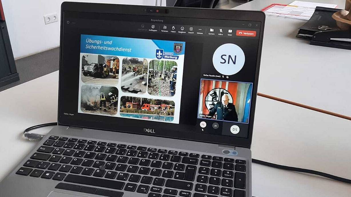 Jürgen Rabbe, Leiter der Freiwilligen Feuerwehr Warburg, berichtet per Videokonferenz aus dem Feuerwehrhaus. Fotos: Dieter Scholz/FW | © Dieter Scholz