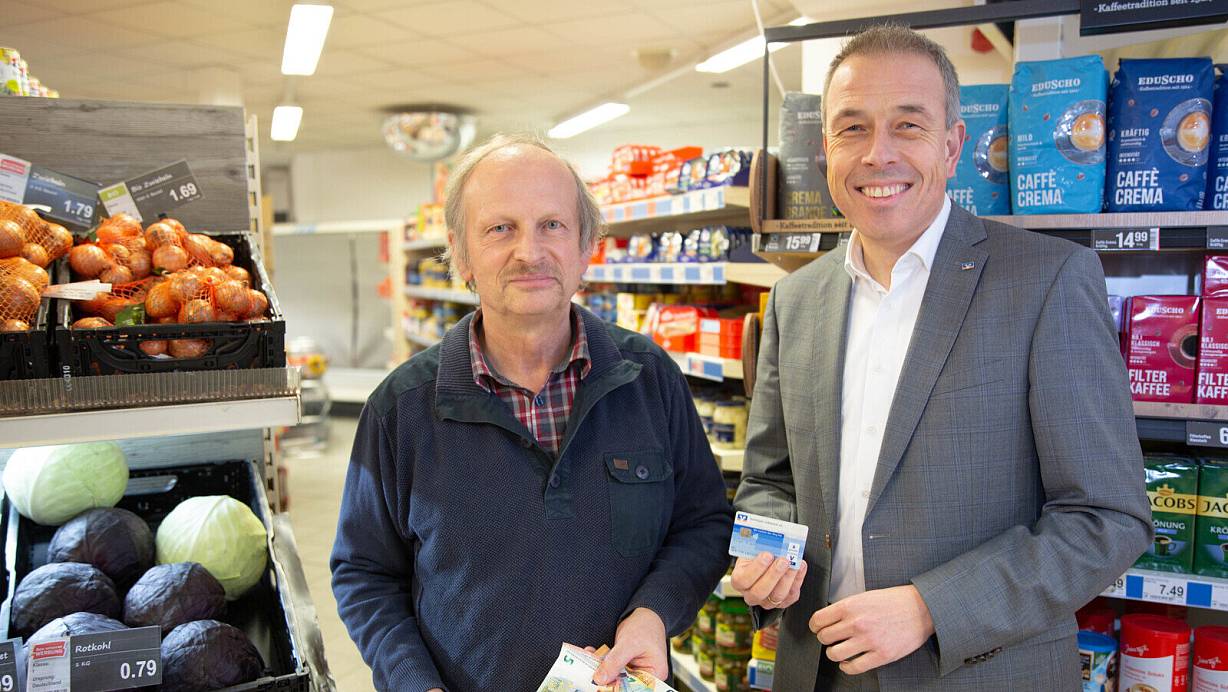 Bargeld-Service in Ossendorf: „Nah und frisch“-Marktleiter Günter Willeke (l.) und Bankvorstand Birger Kriwet. | © Vereinigte Volksbank