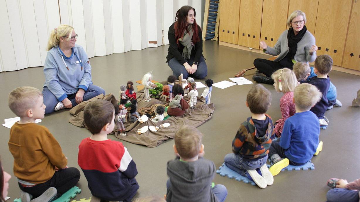 Die Scherfeder Kita-Kinder schauen mit ihren Erzieherinnen Silvia Nolte (v. l.) und Vanessa Bierwierth auf Gemeindereferentin Christina Bolte. Die sogenannten Egli-Figuren veranschaulichen die biblische Szene. Mittendrin die Handpuppe „Sharli“. | © Dieter Scholz